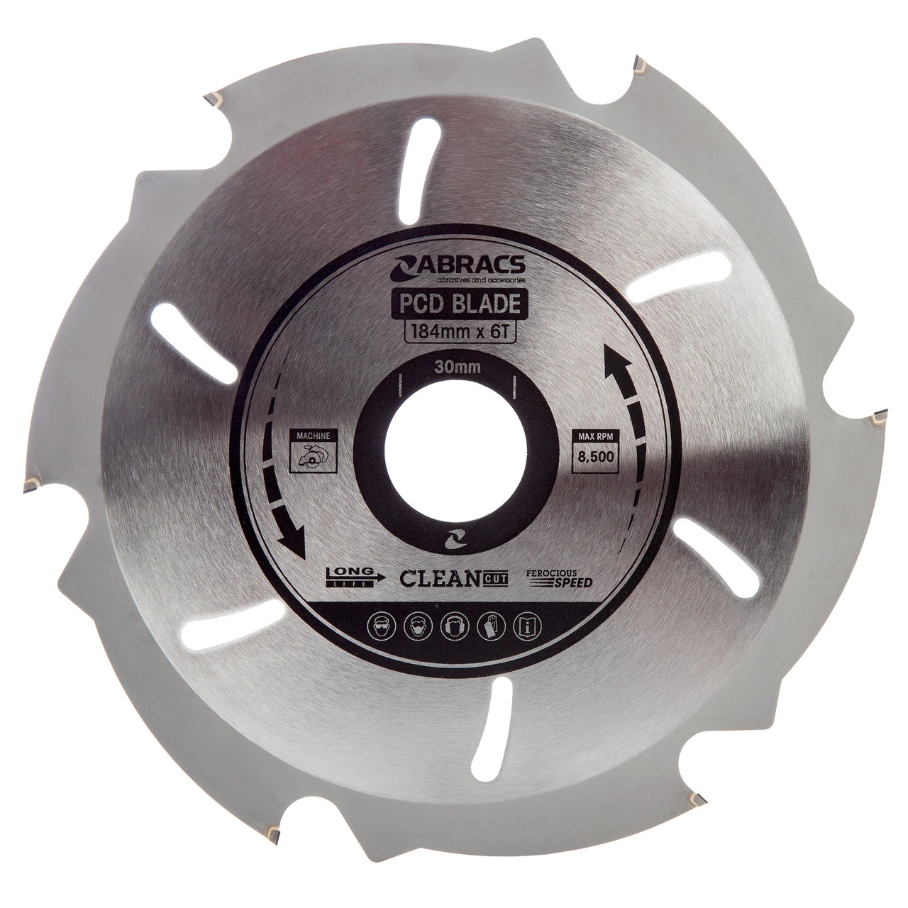 The Abracs PCD1846 is a 184mm Circular Saw Blade with a 30mm Bore. It has an ultra-thin kerf and 6 diamond-tipped teeth and has been designed to be used on a portable saw. Polycrystalline Diamond (PCD) Saw Blades designed for effortless and efficient cutting of Fibre Cement boards and other difficult to cut specialist materials. Extra-large gullet design reduces dust exposure for increased user safety. Ultra-thin kerf improves cutting speeds and accuracy reducing material waste.