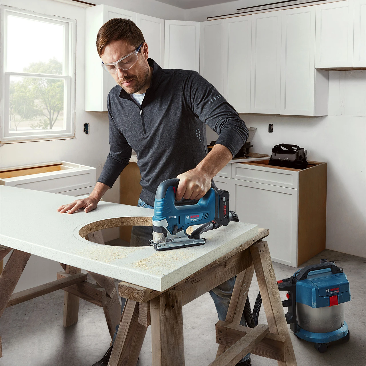 The Bosch GST 18V-125 B Jigsaw with Bow Handle has a robust design and a powerful brushless motor ensuring increased tool longevity and excellent tool runtime. The cordless jigsaw is a reliable problem solver for all applications at an optimal price-performance ratio in its segment. The GST 18V-125 B Professional keeps it simple with a focus on core important functions such as SDS blade holder, LED, 4-stage pendulum, dust blower and Speed Selection. This cordless jigsaw is ideal for curved and cross cuts in solid wood, chipboard, and wood composites as well as for thicker or harder materials. It can be used with guide rails via adapter. The tool is compatible with external dust extraction and with all Bosch Professional 18V batteries and chargers (Professional 18V System). The baseplate of the GST 18V-125 B Professional can be adjusted up to 45° to make bevel cuts. The tool comes with a removable plastic overshoe to protect sensitive workpieces. This model is sold without a battery or charger in a cardboard box.