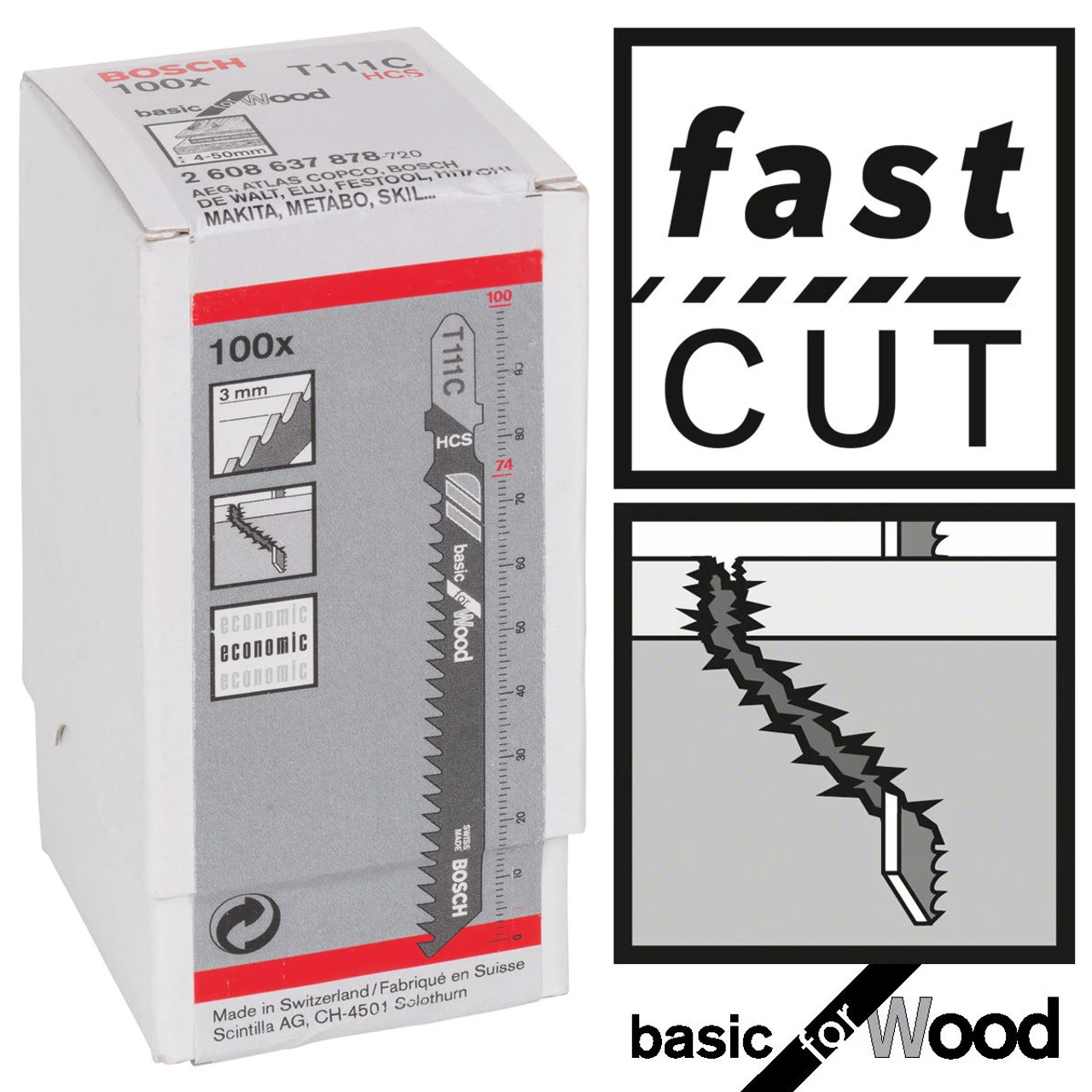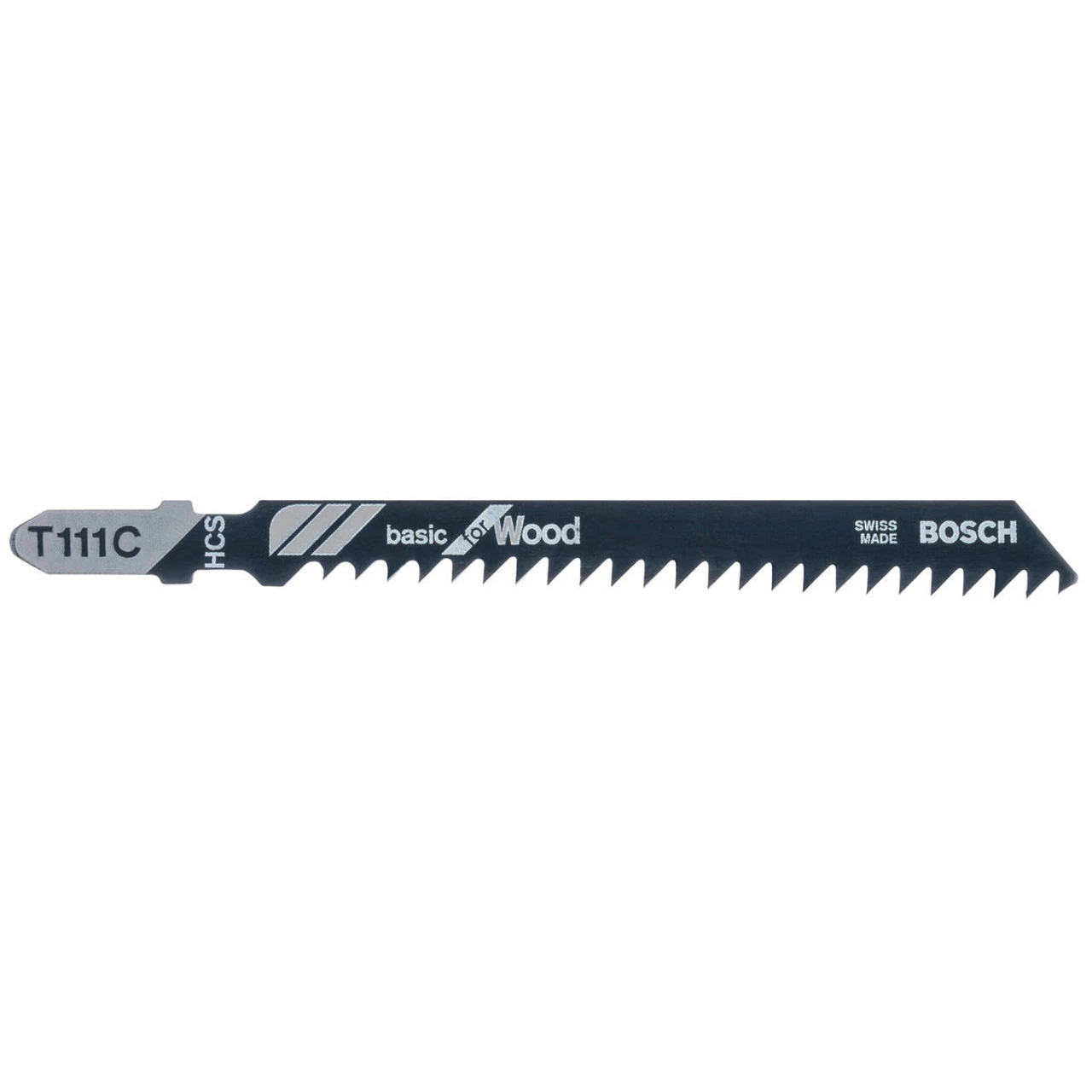 The Bosch T111C (2608637878) “Basic for Wood” blades are an economical choice for cutting wood and wood products. High carbon steel construction for long life. T-shank design for maximum grip and stability which fits 90% of all current jigsaw makes and models. Its milled, side-set teeth are ideal for cuts without special requirements. The blade’s high carbon steel material is appropriate for softwood and non-abrasive woodworking materials. A medium tooth pitch (3 mm) enables the blade to cut woodworking materials with 4-50 mm thickness. For use with jigsaws with T-Shank clamping systems.