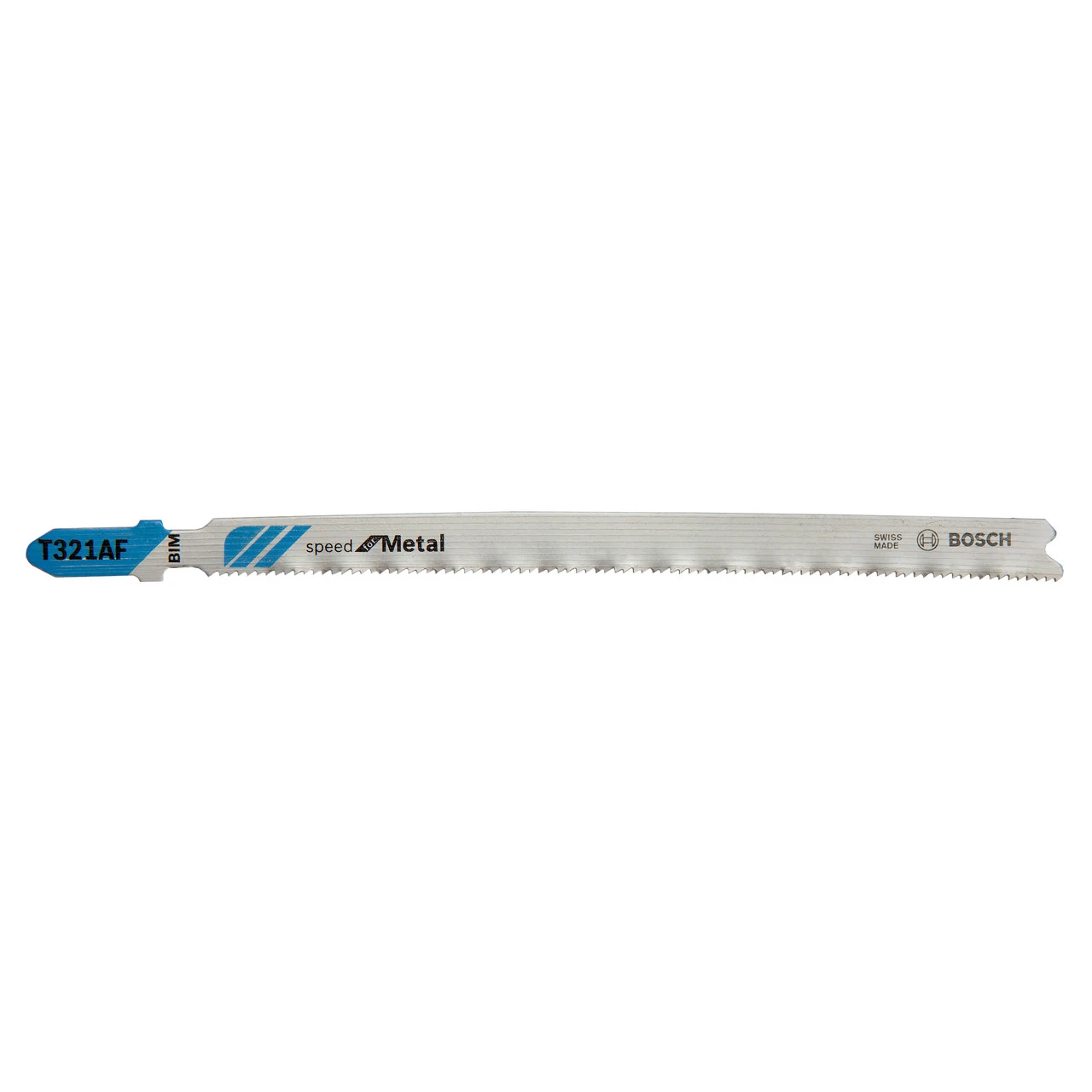 The Bosch T321AF Jigsaw Blades have a patented tooth geometry of aggressive and robust teeth designed to further increase cutting speeds. A Bi-Metal, fully hardened high-speed steel tooth strip and highly elastic carbon steel body make the blade breakproof. The blades have a very fine tooth pitch suited to cutting thin-wall metal pipes and profiles (1-3 mm).