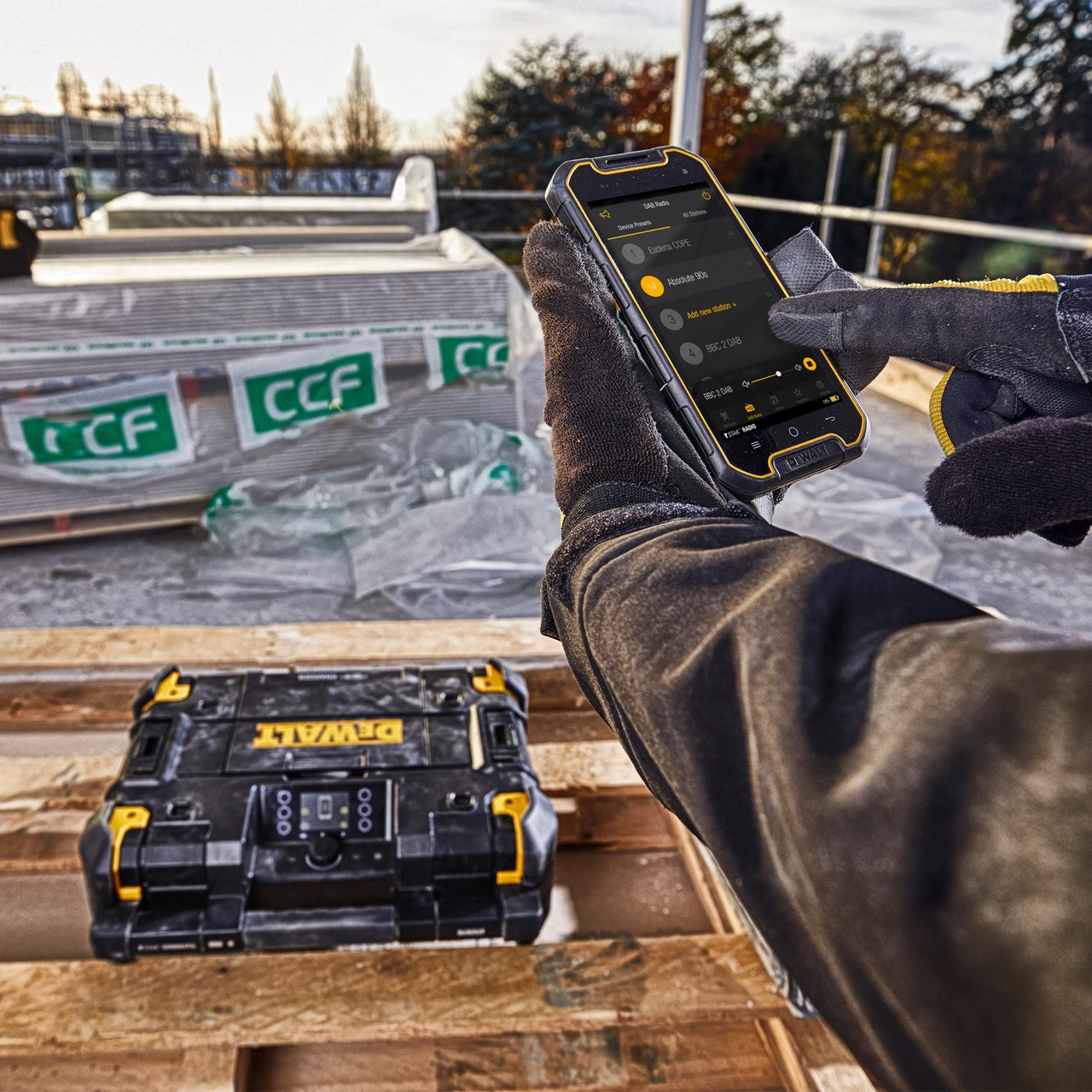 The Dewalt DWST1-81079 Job Site Radio and Battery Charger is 18 Volt and FLEXVOLT battery compatible. The Radio has FM, AM and DAB+, with a 45 Wattage Output. Fitted with TSTAK stacking latches and also incorporating shock absorbing rubber bumpers on all 4 corners to ensure tough on site protection. This heavy duty site radio has 4 mid range speakers to the front, top and bottom and 2 powerful sub-woofers underneath, which together give a fantastic sound quality. The radio can be controlled remotely via your Android or Apple device using the DeWalt Mobile App, allowing for complete control of the device on site, and with BLE (Bluetooth Low Energy), you stay connected without sacrificing your battery. The Radio also features a full colour & rotating screen, easily editable preset DAB and FM radio stations, an integrated music player that allows streaming music of your own, USB charger, 3.5mm Auxiliary and a large IP54 rated storage and battery compartment. With FLEXVOLT Compatibility, the DWST1-81079 can be powered using either a DCB546 6.0Ah or a DCB547 9.0Ah battery giving unbelievable runtime. When connected to the mains, it doubles up as a battery charger too.
