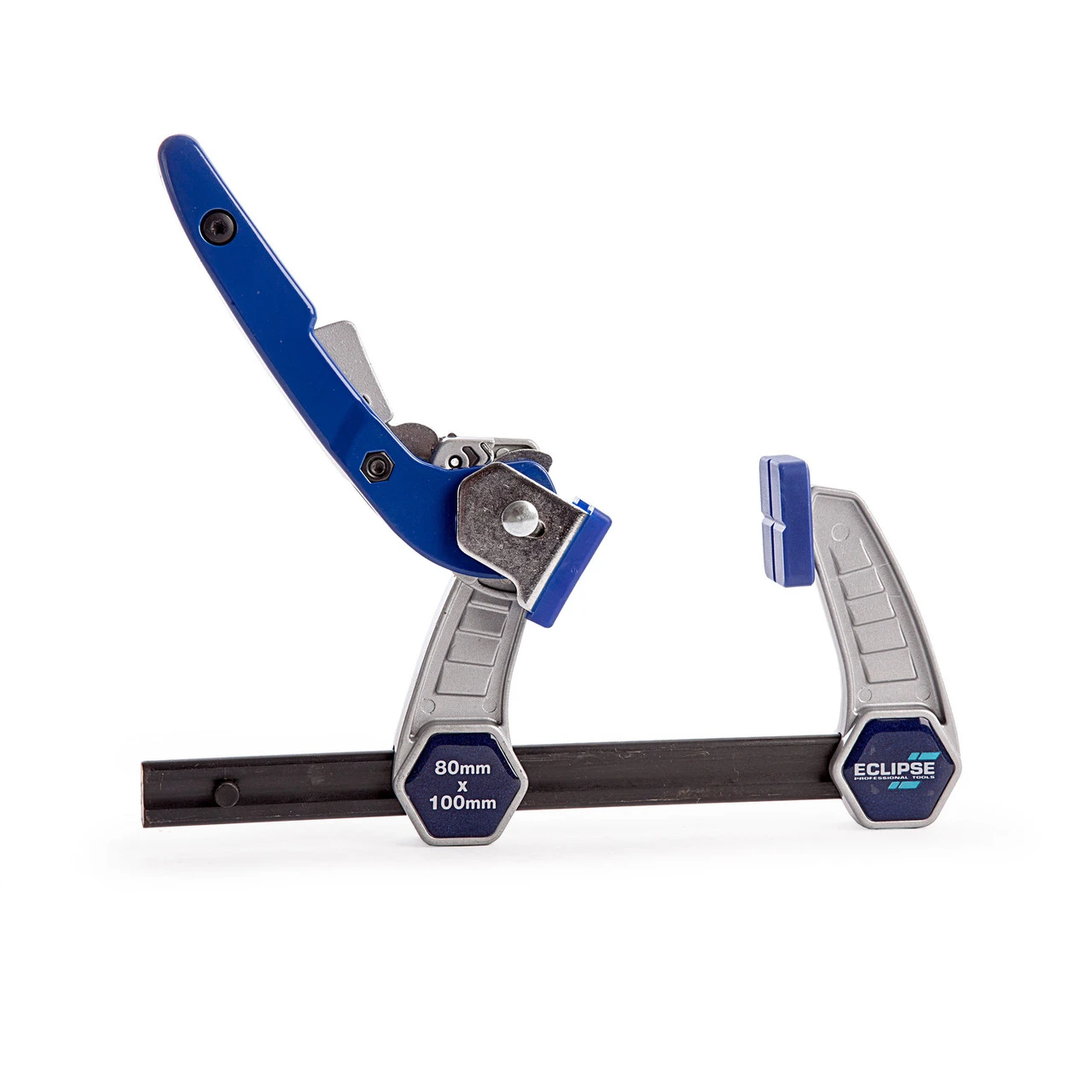 The Eclipse ELC80-4 Quick Release Lever Clamp is ideal for gluing, positioning & fastening in wood working applications. The lightweight aluminium frames are both strong and durable. Lever-operated ratcheting clamp arm is easy to operate and generates secure clamping power and locks onto the workpiece with ease.