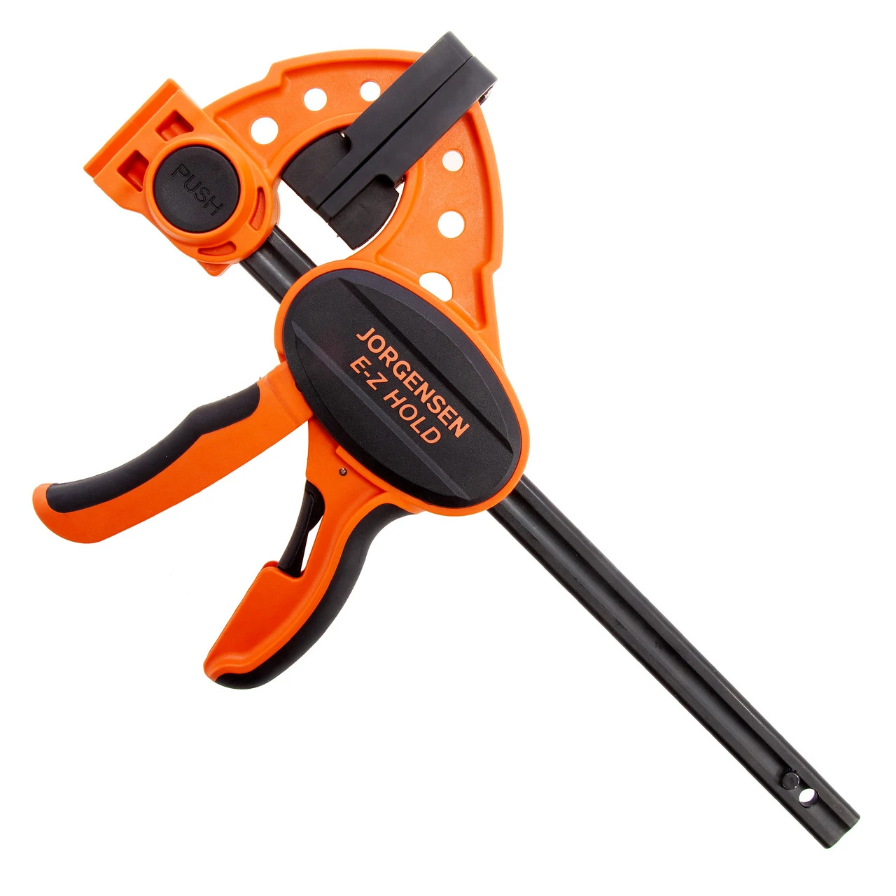 The 33406 is the 6 Inch version of the unique Jorgensen E-Z HOLD bar clamps range which allow for rapid, easy clamping and can easily be converted to spreader clamps. The contoured comfort grip and quick-release lever make it simple to get a firm grasp, and our exclusive patented feature lets you join two clamps together to create a clamp with more than double the opening capacity of a single clamp. Deep-reach pads help protect your work. Pony Jorgensen offers a wide range of bar clamps ideal for DIYers, hobbyists, carpenters, cabinetmakers, woodworkers, metalworkers, and everyone in between. Made with high-quality aluminum and steel to last as long as the pieces you craft. For those who cut wood not corners.