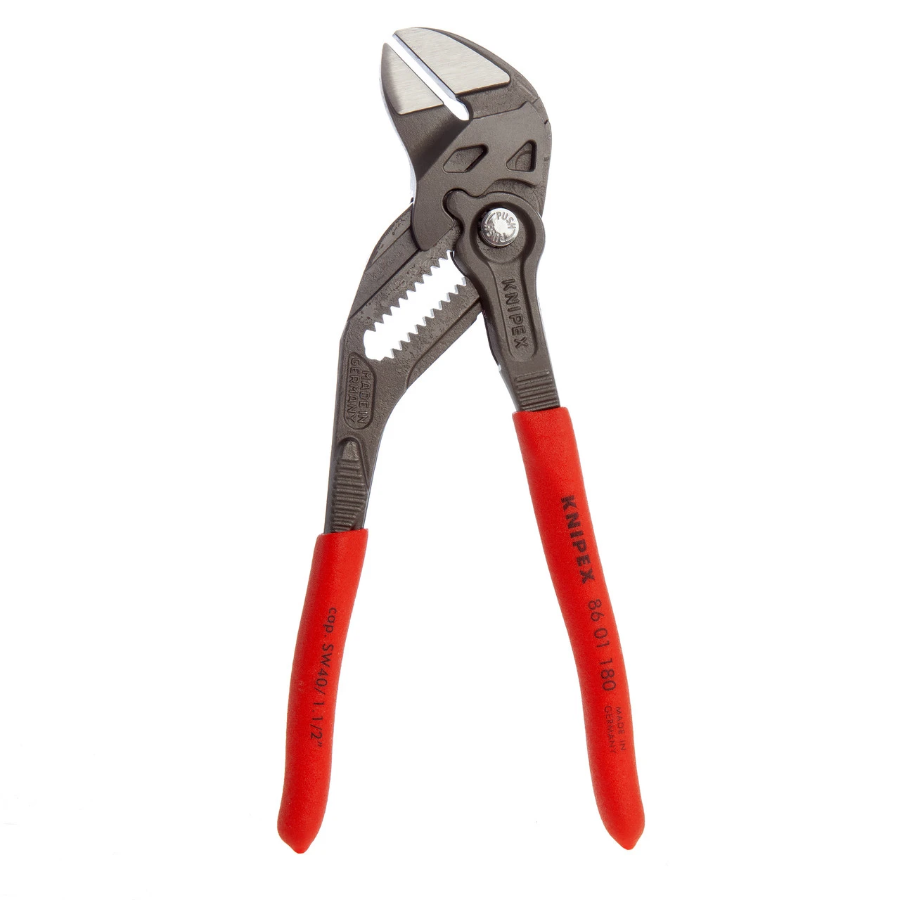 The Knipex 8601180SB Pliers + Wrench 2 in 1 have smooth jaws to grip all parallel surfaces in the capacity range. With a high degree of pressure if necessary they open up almost unlimited application possibilities. For tightening locknuts, exerting pressure to activate the adhesive power of contact adhesives, edge breaking in tile work, snapping cable ties, utilisation as a small vice.
