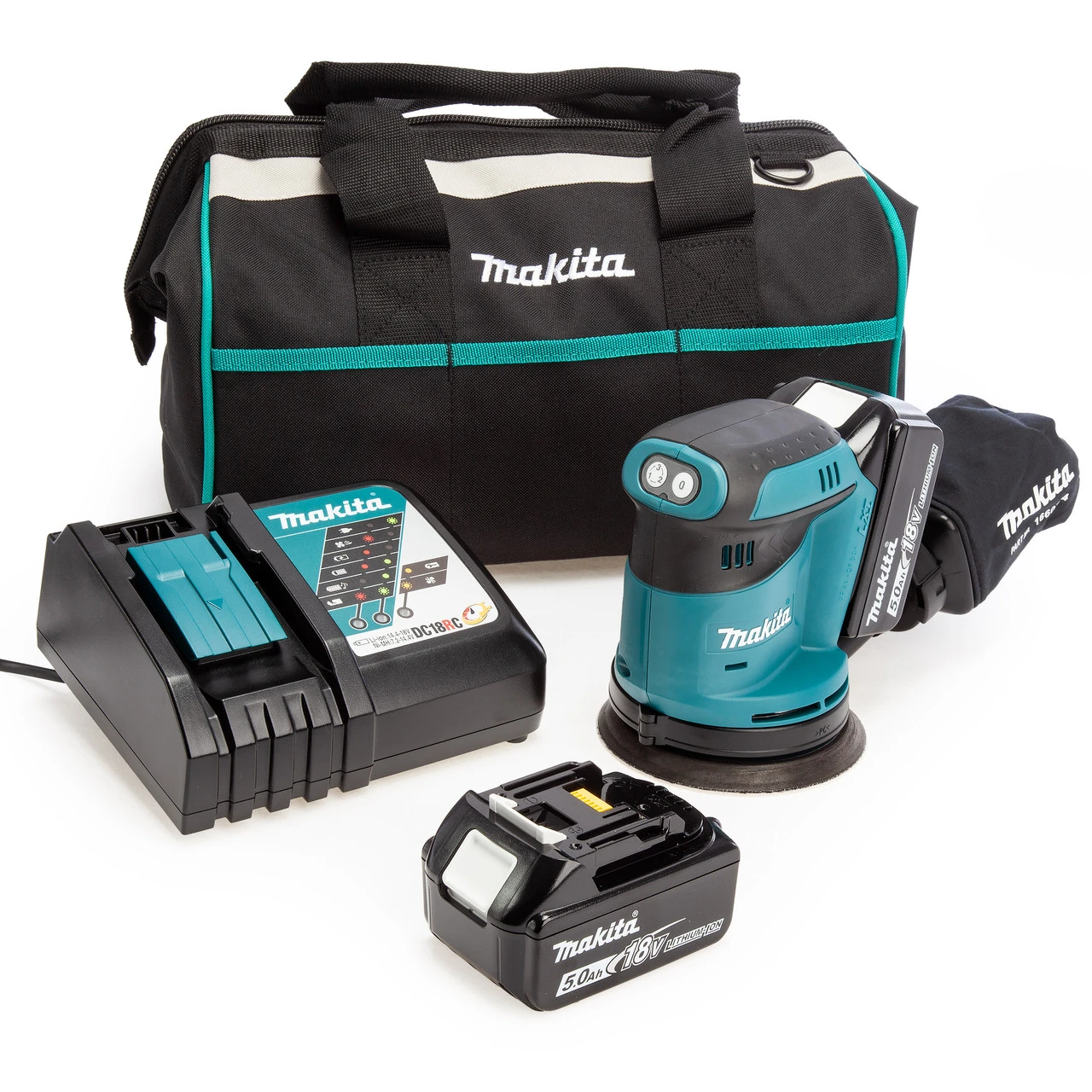 Makita DBO180 18V LXT 5 inch/125mm Sander, Toolbag, Charger (2 x 5.0Ah Batteries)