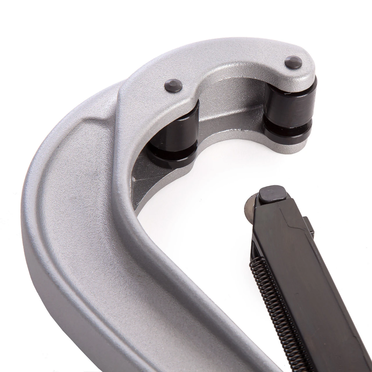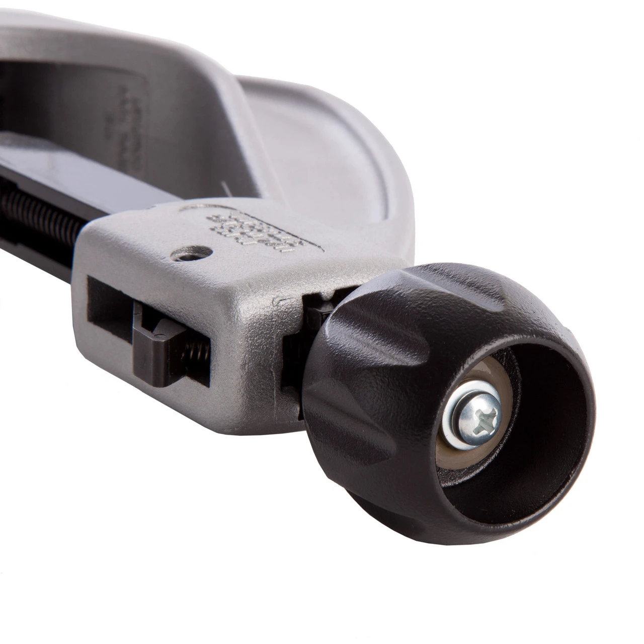 Designed for cutting plastic or metallic tubing. The Model No. 153 Quick Acting Tubing Cutter features a quick-acting design, I-beam construction, hardened wear surfaces and thrust bearing slide assemblies for smooth operation. Includes an X-CEL Knob and X-CEL Pin for quicker cutting and wheel replacement. The X_CEL Knob cuts tubing more quickly and easily with our larger, more ergonomic design. The X_CEL Wheel Pin changes your cutter wheel quickly using The new ball detent design, no tool needed, no lost clips. Spare cutter wheel included inside knob for maximum uptime.