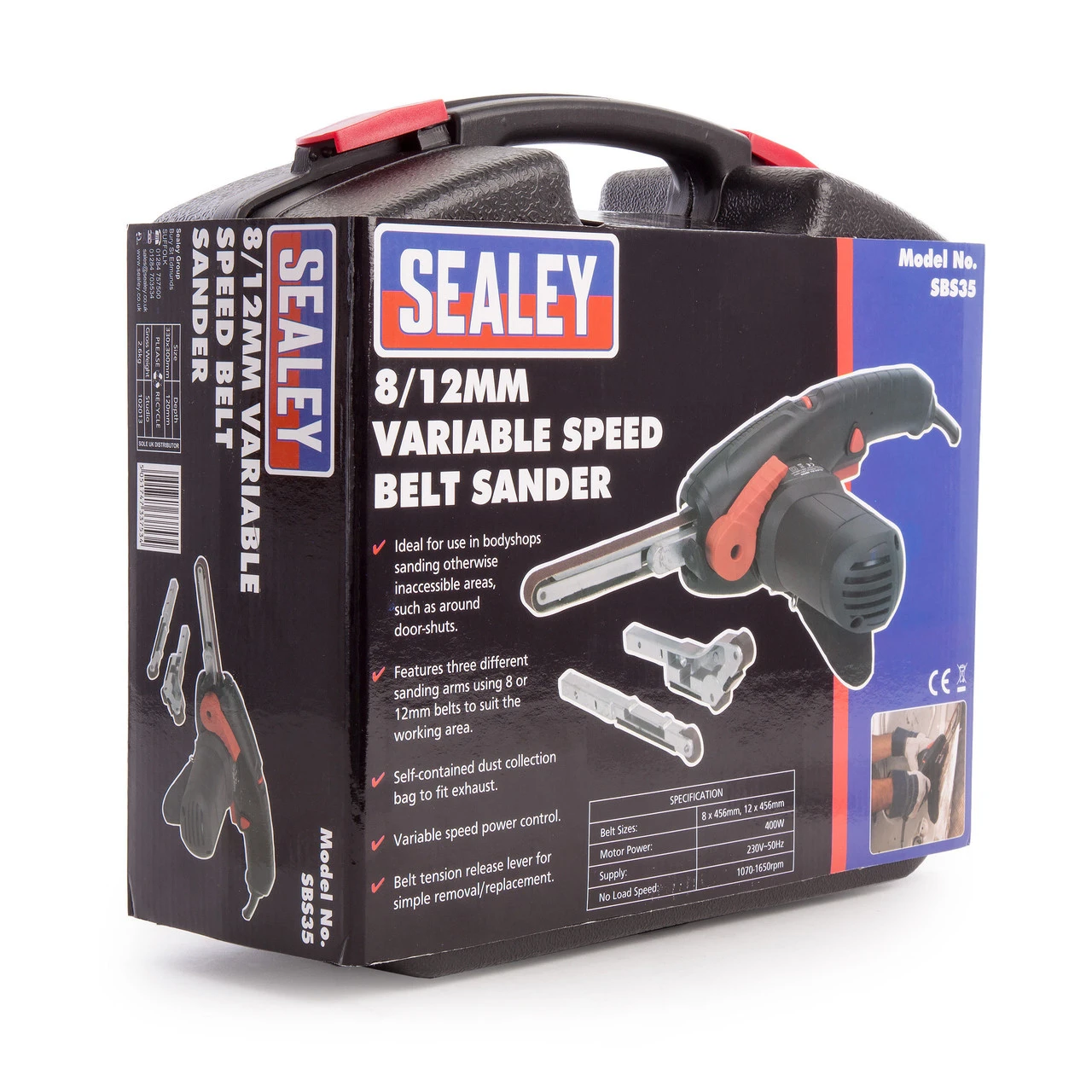 The Sealey SBS35 belt sander features variable speed control so you can tailor the speed to the application. It is ideal for use in body shops or sanding inaccessible areas such as around door-shuts. It offers a no-load speed of 900-1400rpm.