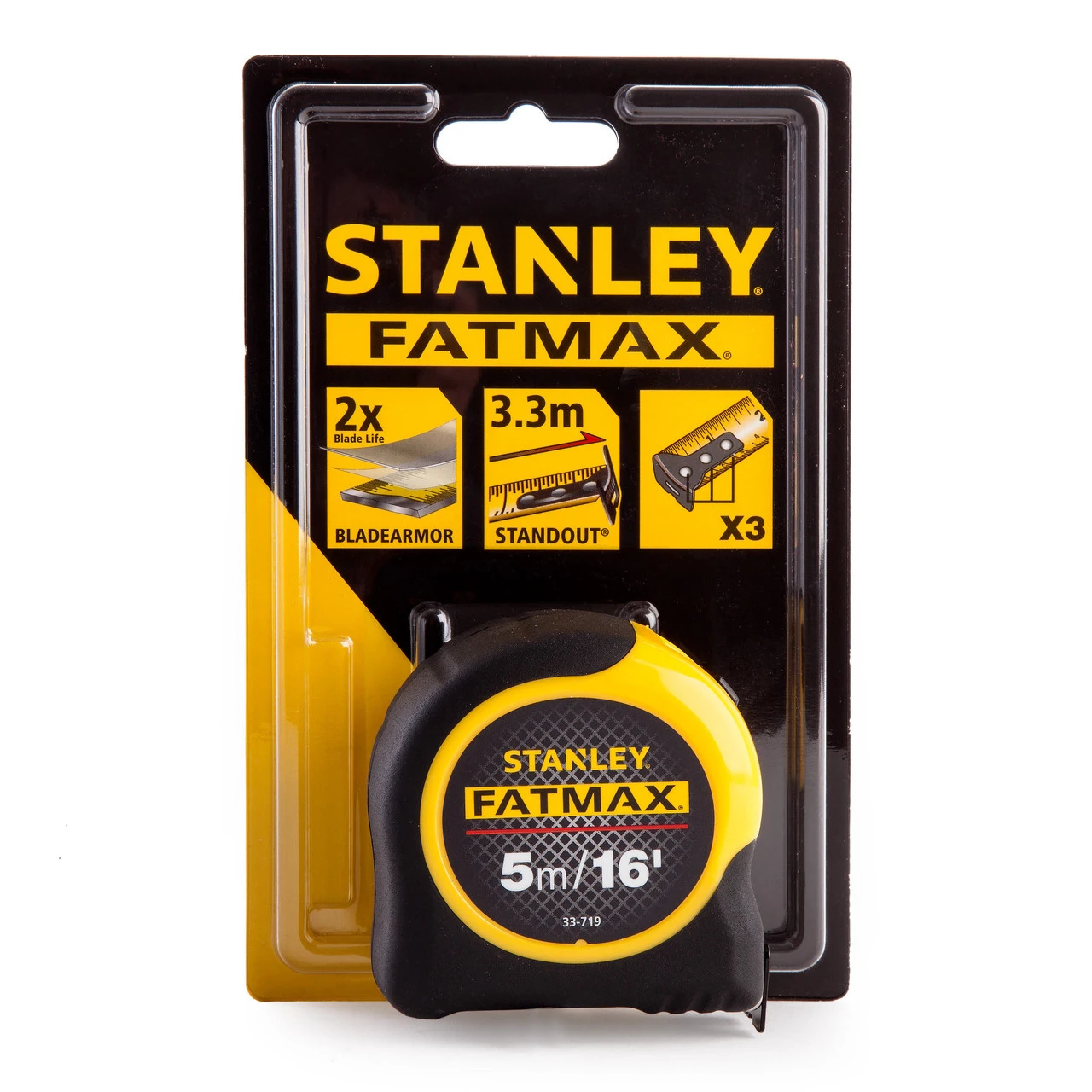 The Stanley 0-33-719 FatMax tape measure with blade armor coating has an extra-wide 32 mm blade which gives up to 3.35 metre stand out and enables easier reading. Featuring both metric and imperial readings with a comfortable cushion grip, this tape is extremely easy to operate and use. You can expect a much longer life from this tape measure compared to competitors thanks to its Mylar blade coating and shock-resistant case.