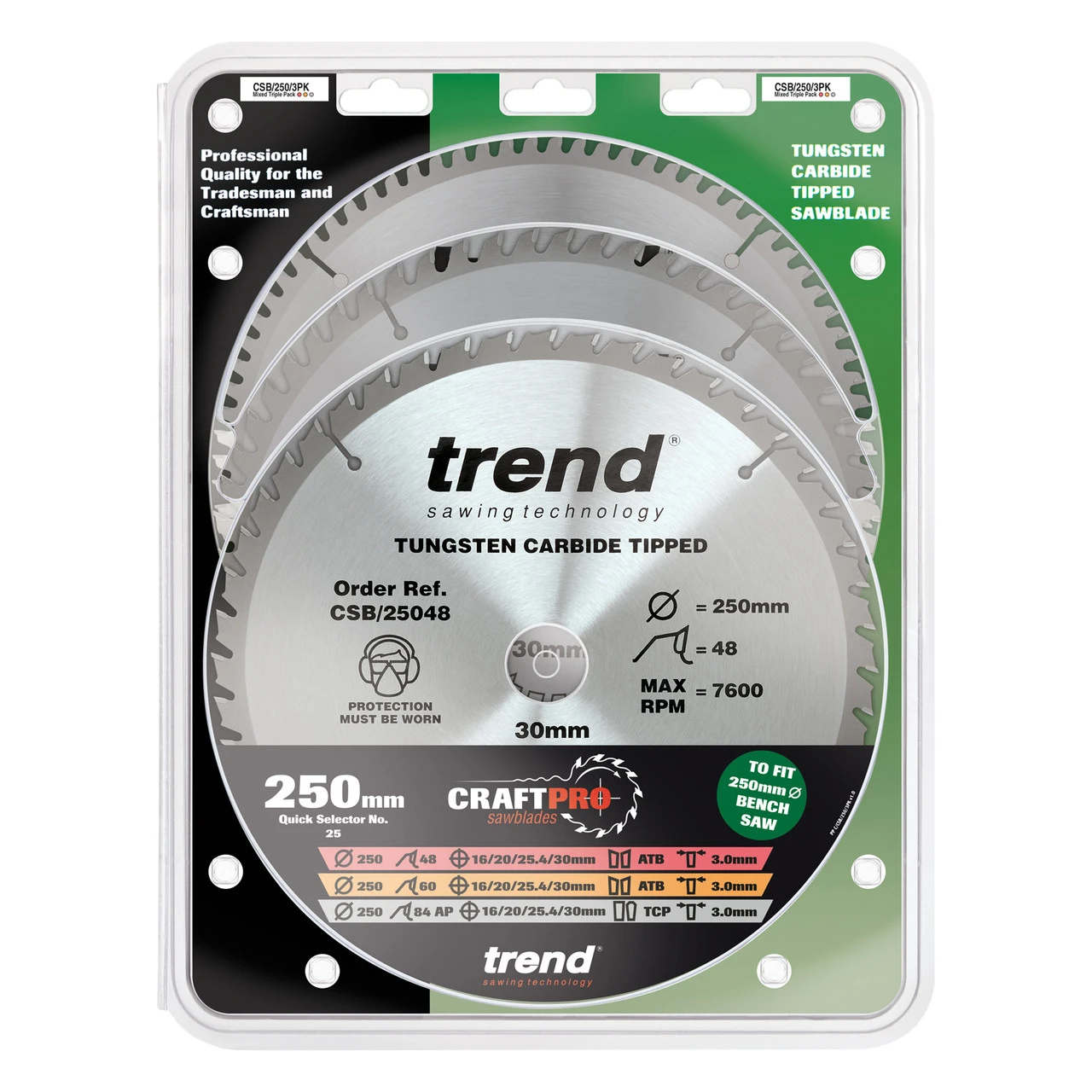 This triple pack of Trend CSB/250/3PK blades are designed for a professional finish in soft wood, hard wood, plywood, soft fibre, plasterboard stone, fibre board, cement bonded board and particle board. The 250mm multi-pack of same diameter Tungsten Carbide Tipped Circular Sawblades, designed to fit a Bench Saw, have tooth counts of 48, 60 & 84 to give a finish from Medium to Medium/Fine. All blades have a 30mm bore and come with a variety of bushing washers from 16mm to 26mm.