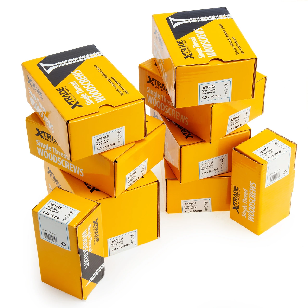 The XTrade X0800002 consists of 1400 PZ2 woodscrews in a variety of popular sizes in a cardboard box. There are 9 different sizes of woodscrew in the box, each within their own idividual boxes. Sizes and quantities are listed below.